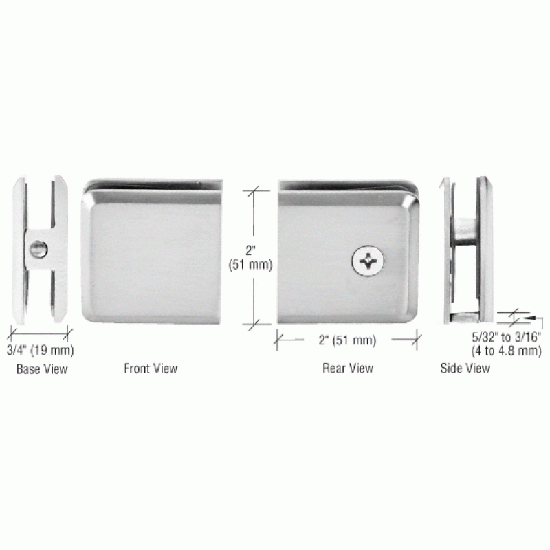 Our BU4CH Chrome Square Style Beveled Notch-in-Glass Fixed Panel BCU4CH CBU4CH Type U-Clamps (Hole-in-Glass Style) mount directly to the wall, ceiling or floor to secure vertical fixed glass panels. Clearance between the glass and the wall is 3/16" (5 mm). Clear silicone can be used to provide a clean, water resistant seal.